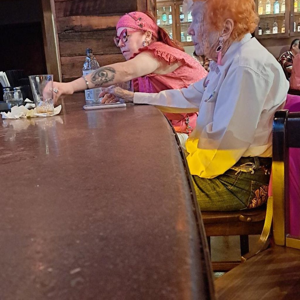 Kay and I were talking about these older ladies who lose a husband, whether it be through death or divorce, and the just stay home and dry up because they don’t know what else to do. Now, it ain’t like I’m setting the world on fire and out there tearing it up, but I do feel like I’m in the mix of things regularly. You wanna get out! It’s good for you. Kay said, “I wanna see the pink ladies!” Indeed. Me too. I wanna be eccentric and not give one red rat’s ass what anybody thinks about me, just like always. I hope I’ve always got a friend who doesn’t bat an eye. But who will also gently persuade me to leave the bunny ears at home. Unless I’m just dead set on them.